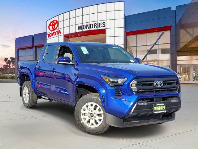 Blue 2025 Toyota Tacoma SR5 4WD 8-Speed Automatic 2.4L 4-Cylinder Tacoma SR5, 4D Double Cab, 2.4L 4-Cylinder, 8-Speed Automatic, 4WD, Blue, Boulder Fabric Cloth, 6 Speakers, Air Conditioning, All Weather Floor Liners (TMS), AM/FM radio: SiriusXM, Apple CarPlay/Android Auto, Auto High-beam Headlights, Auto-dimming Rear-View mirror, Brake assist, Electronic Stability Control, Exterior Parking Camera Rear, Front fog lights, Power steering, Power windows, Radio: 8" Toyota Audio Multimedia, Rear window defroster, Remote keyless entry, Steering wheel mounted audio controls.